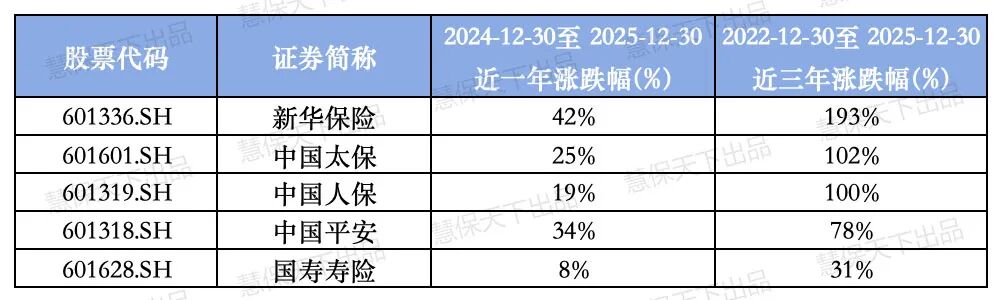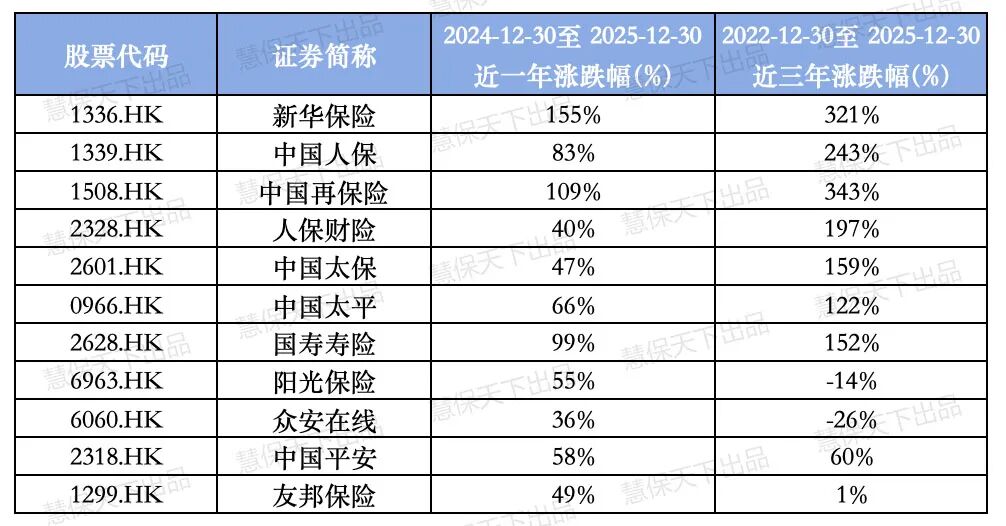 截至12月30日,中国再保险以近一年109%、近三年343%的涨幅稳居板块首位,新华保险紧随其后,近一年涨幅攀升至155%,近三年累计涨幅达321%,两大标的共同构筑“三年三倍级”收益标杆。
